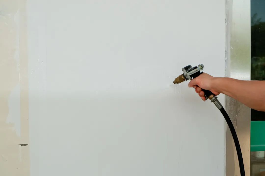 面层高压水枪测试显示,普通墙面在高压水流冲击下出现水渍和材料剥落,而弹性聚氨酯墙面完好如初,展现出卓越的防水性能。