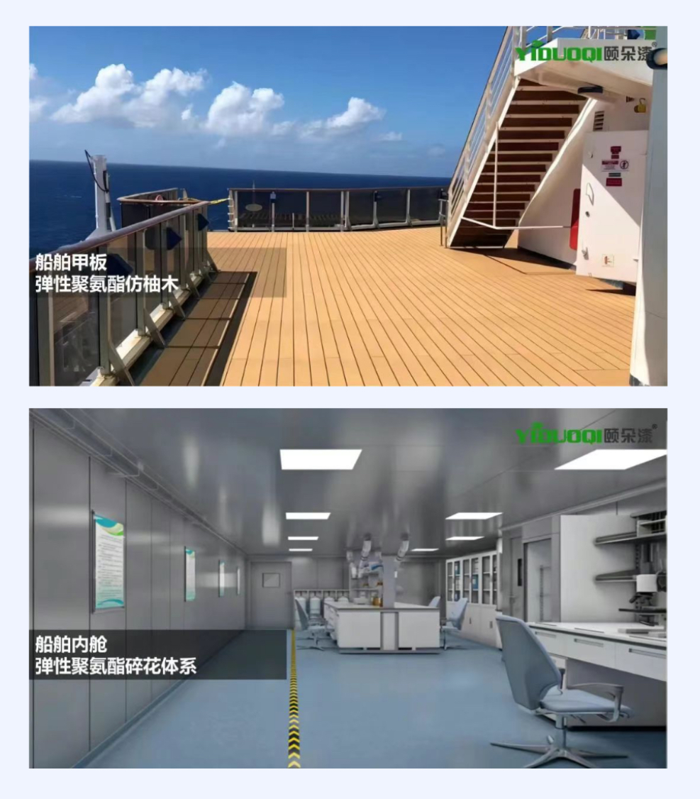 A:适合。弹性聚氨酯地坪能有效应对潮湿环境,是食品加工厂、酒厂、饮料厂湿区地面的理想解决方案,材料具备优异的耐水性,还有防滑性,固化后的地面不怕长期水泡以及耐腐蚀,即便在潮湿条件下,仍能保持卓越的使用性能。面对海水侵袭的船舶地面也是如此,YIDUOQI颐朵漆弹性聚氨酯体系可应用于船舶甲板与内舱,其防水防霉防潮的特性,能为船舶带去持久耐用的地面。除此之外,室外露台和户外步道等场景在下雨时也会形成潮湿环境,弹性聚氨酯在这些场景中的应用同样表现出色。需要特别注意的是,施工时基础表面的干燥至关重要,只有在干燥的基础上施工,才能确保地坪固化后的良好性能和使用寿命。