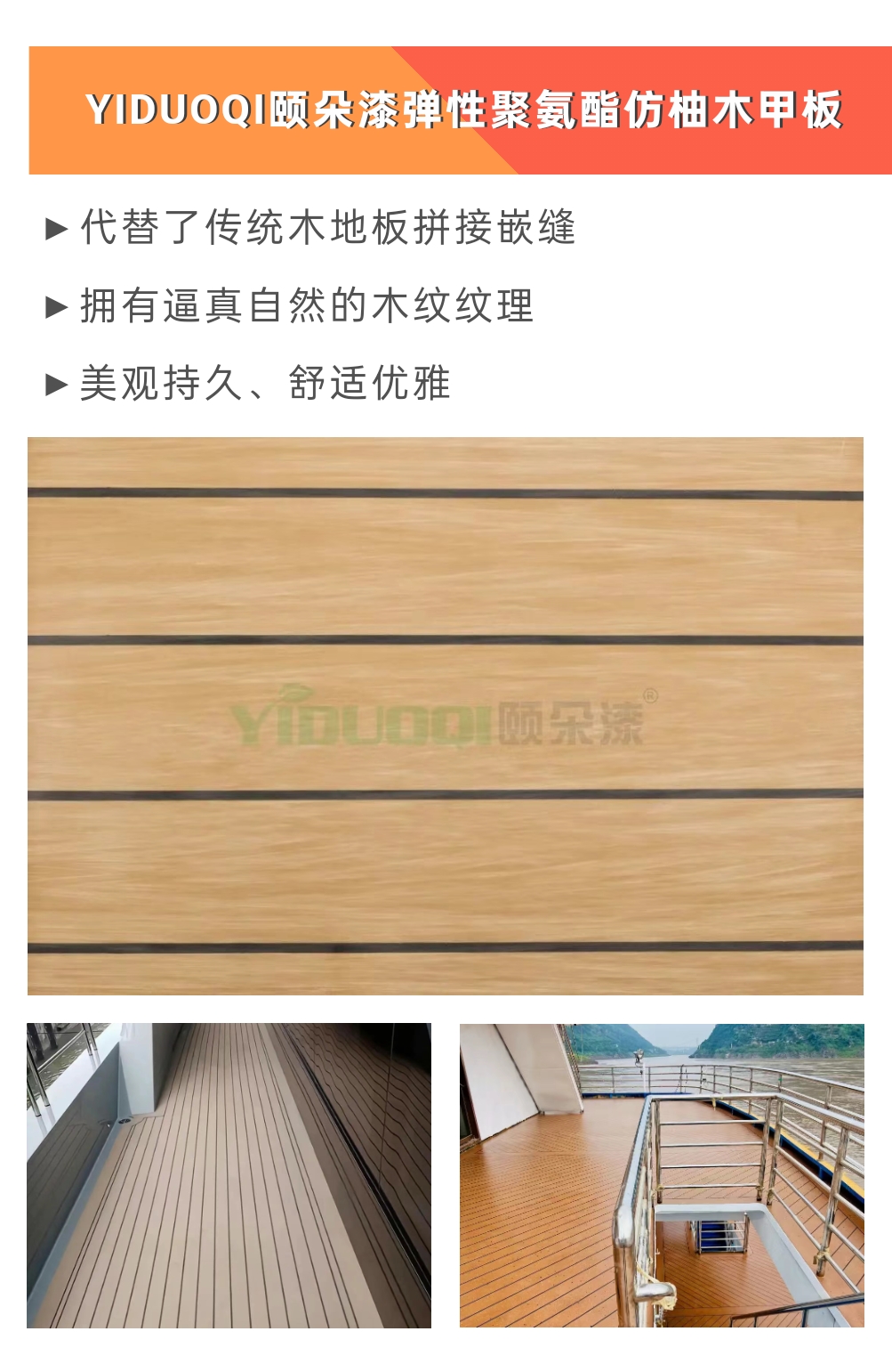 YIDUOQI颐朵漆弹性聚氨酯仿柚木甲板,代替了传统木地板拼接嵌缝,拥有逼真自然的木纹纹理,美观持久、舒适优雅。
