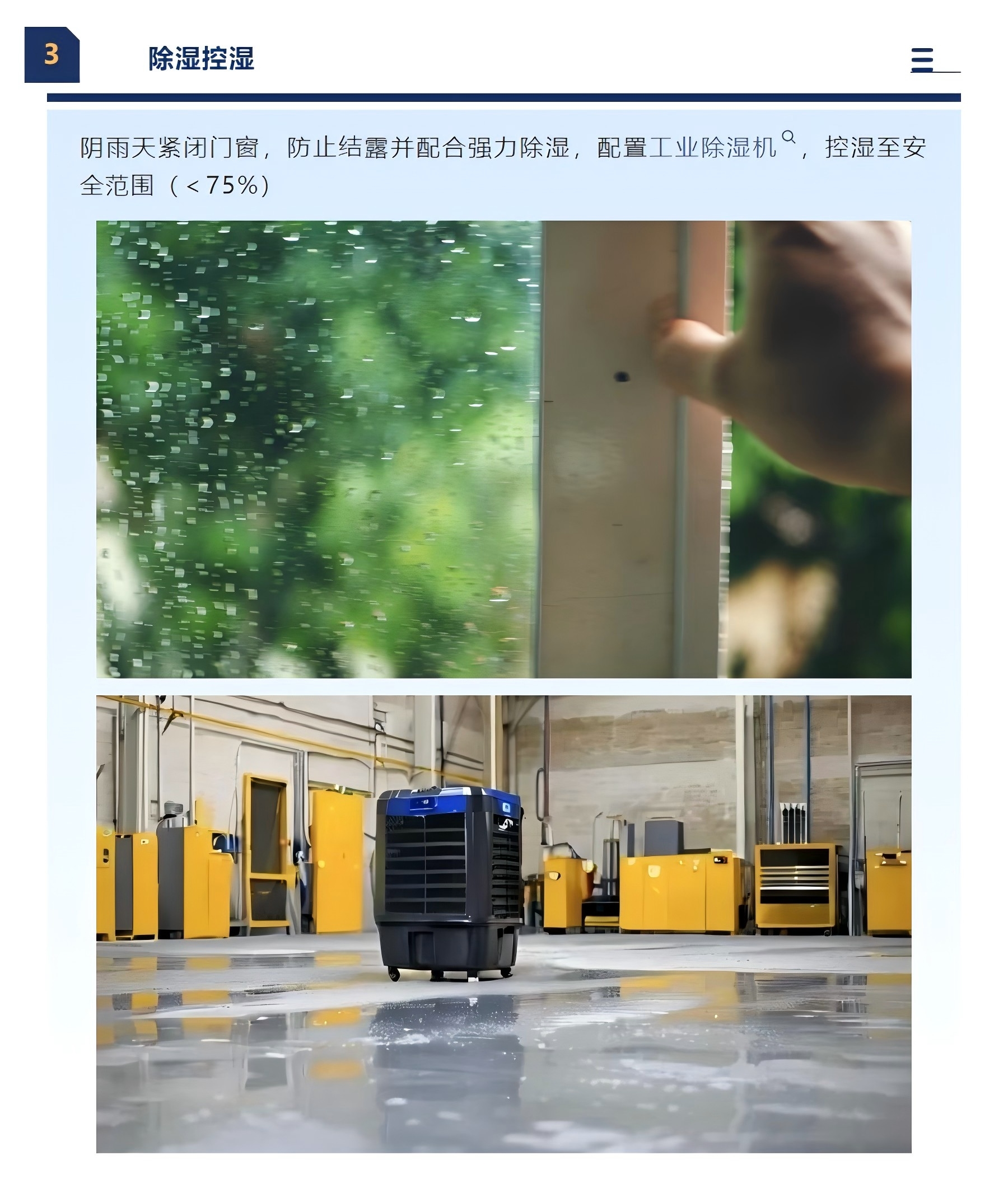 3、除湿控湿:阴雨天紧闭门窗,防止结露并配合强力除湿,配置工业除湿机,控湿至安全范围(<75%)。