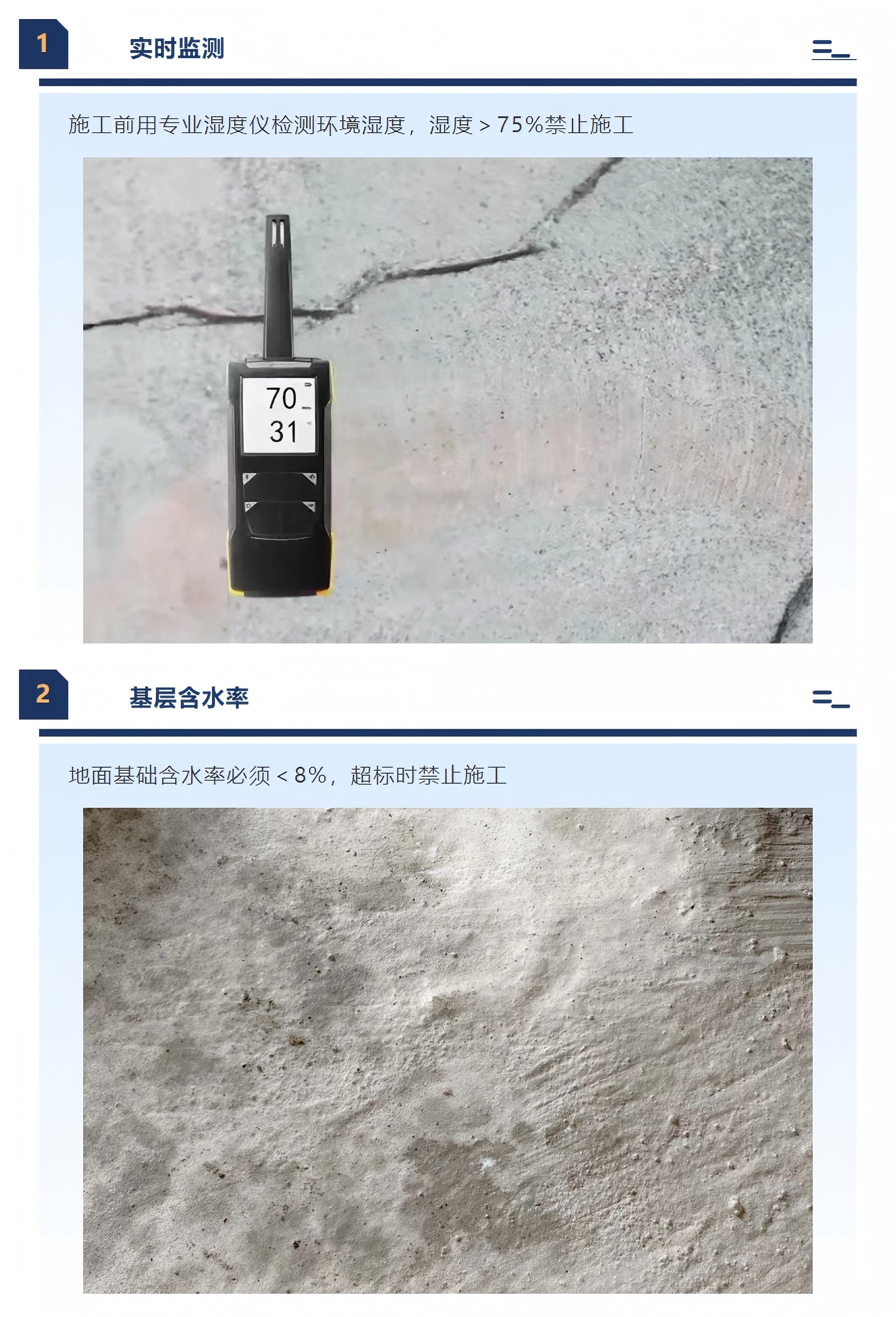 1、实时监测:施工前用专业湿度仪检测环境湿度,湿度>75%禁止施工;