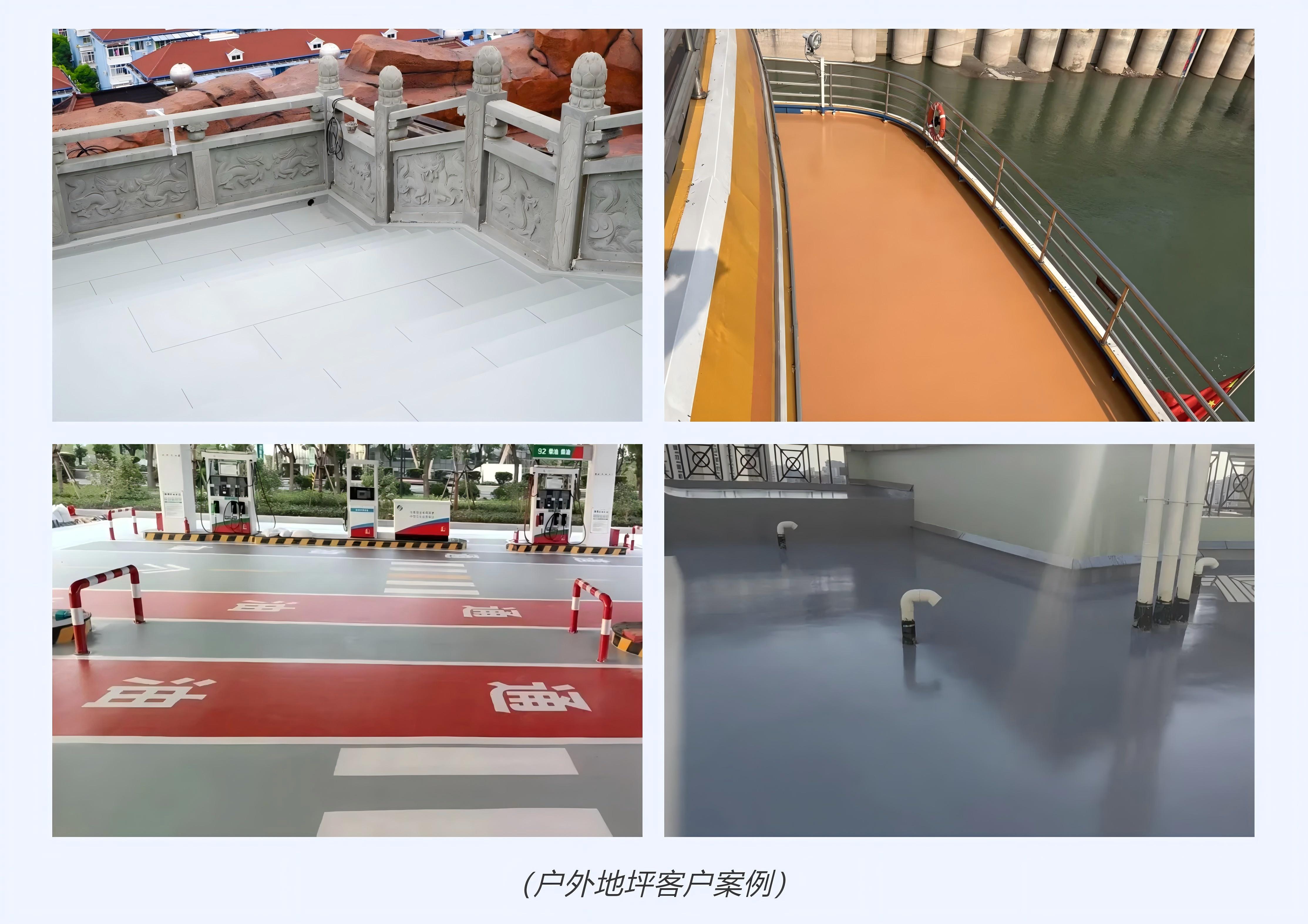 对于完全暴露在户外的场所,比如露台、屋顶平台、船舶甲板、加油站地面等,耐候性是必要的。因为这类环境常年经受强烈紫外线暴晒、雨水冲刷和明显温差变化,普通地坪材料时间一长就容易出现老化开裂或者褪色问题。而耐候型产品,大大提升了抗紫外线能力、整体耐候性和耐老化性,能有效应对这些挑战,大幅延长地面的使用寿命,帮您节省后续维护费用。