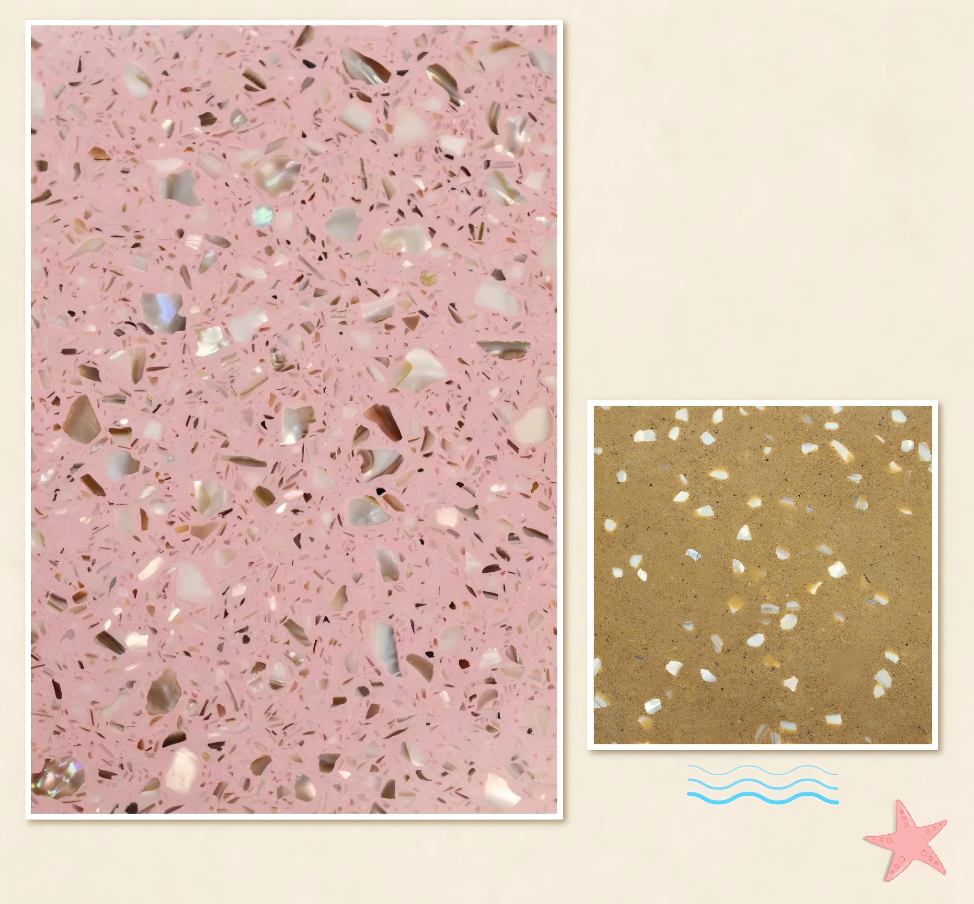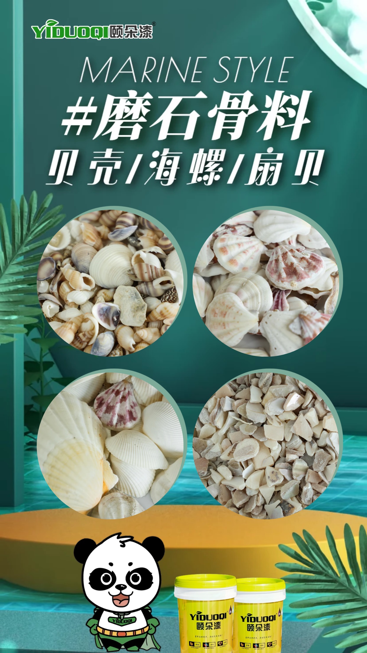 拾取海岸线的馈赠,将海洋里的天然材质,细腻融入,YIDUOQI颐朵漆弹性聚氨酯磨石(生物基耐候弹性聚氨酯砂浆磨石)海洋贝壳艺术款,呈现一片流动的海岸艺术。丰富贝壳类骨料,让磨石的每一处都是独一无二的纹理,成就空间的自由与个性。