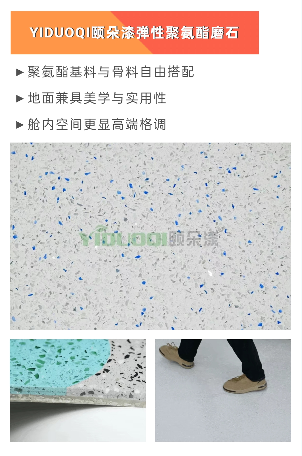 YIDUOQI颐朵漆弹性聚氨酯磨石,聚氨酯基料与骨料自由搭配,地面兼具美学与实用性,舱内空间更显高端格调。