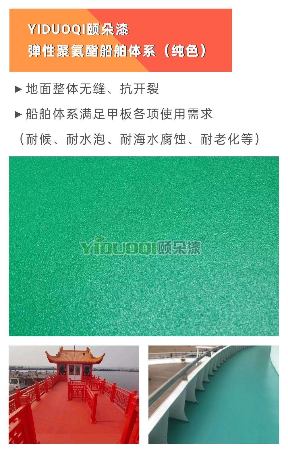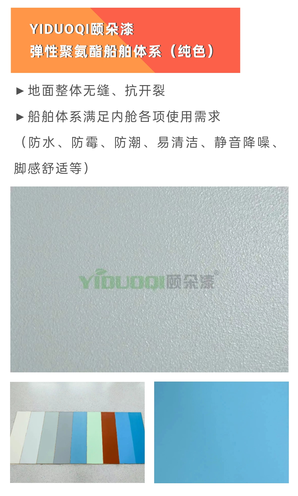 船舶甲板地面可选YIDUOQI颐朵漆弹性聚氨酯船舶体系(纯色),地面整体无缝、抗开裂,船舶体系满足甲板各项使用需求(耐候、耐水泡、耐海水腐蚀、耐老化等)。