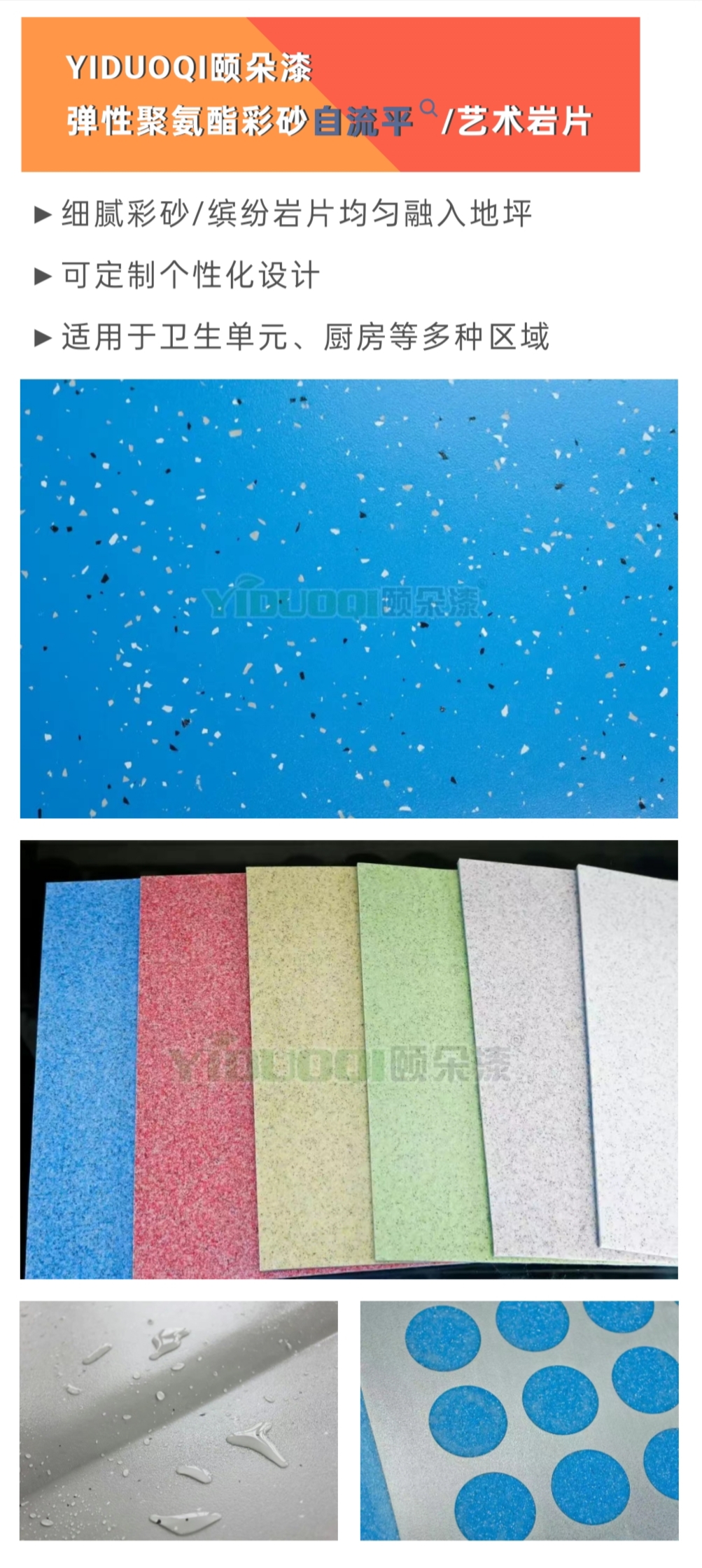 YIDUOQI颐朵漆弹性聚氨酯彩砂自流平/艺术岩片,细腻彩砂/缤纷岩片均匀融入地坪,可定制个性化设计,适用于卫生单元、厨房等多种区域。