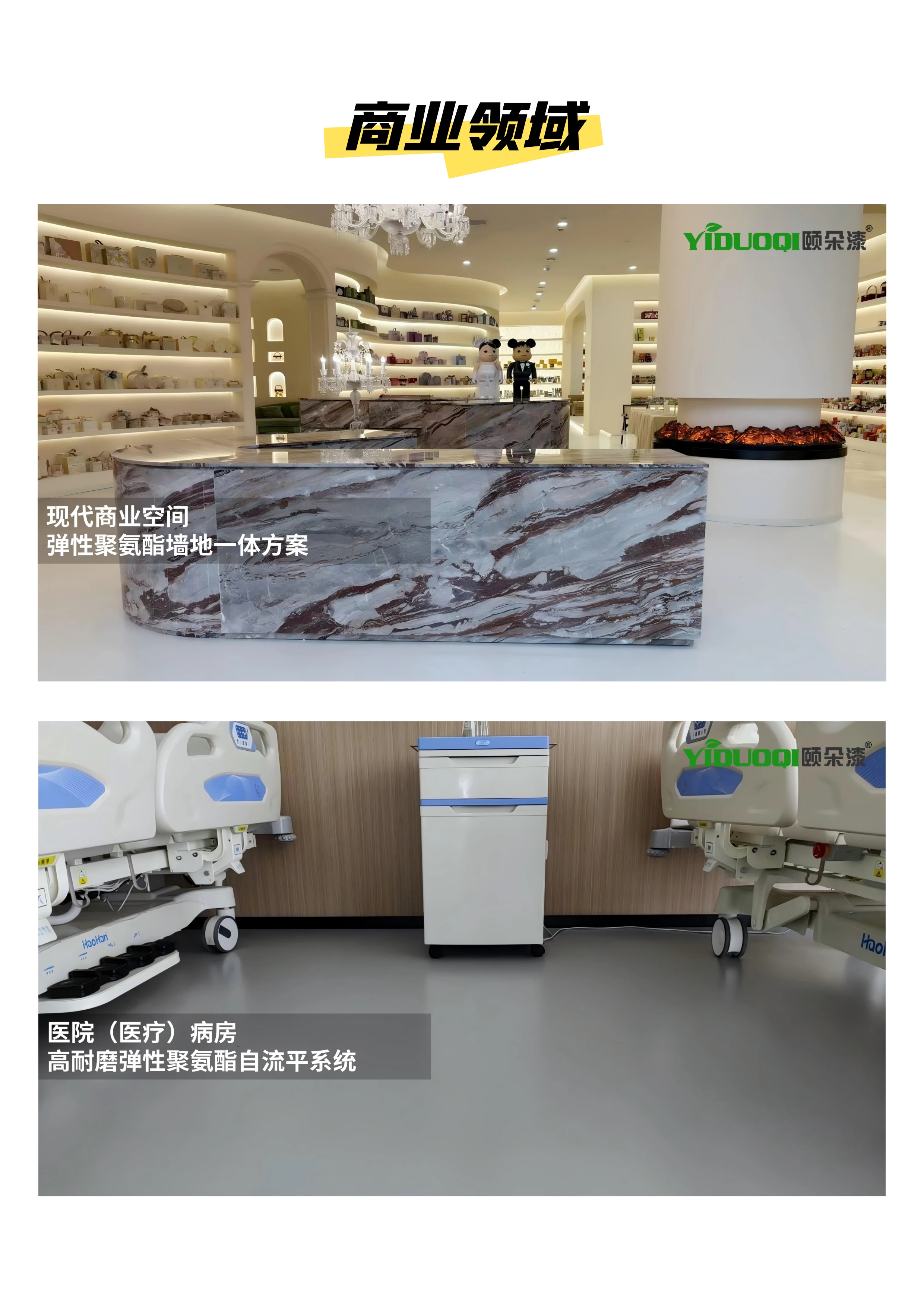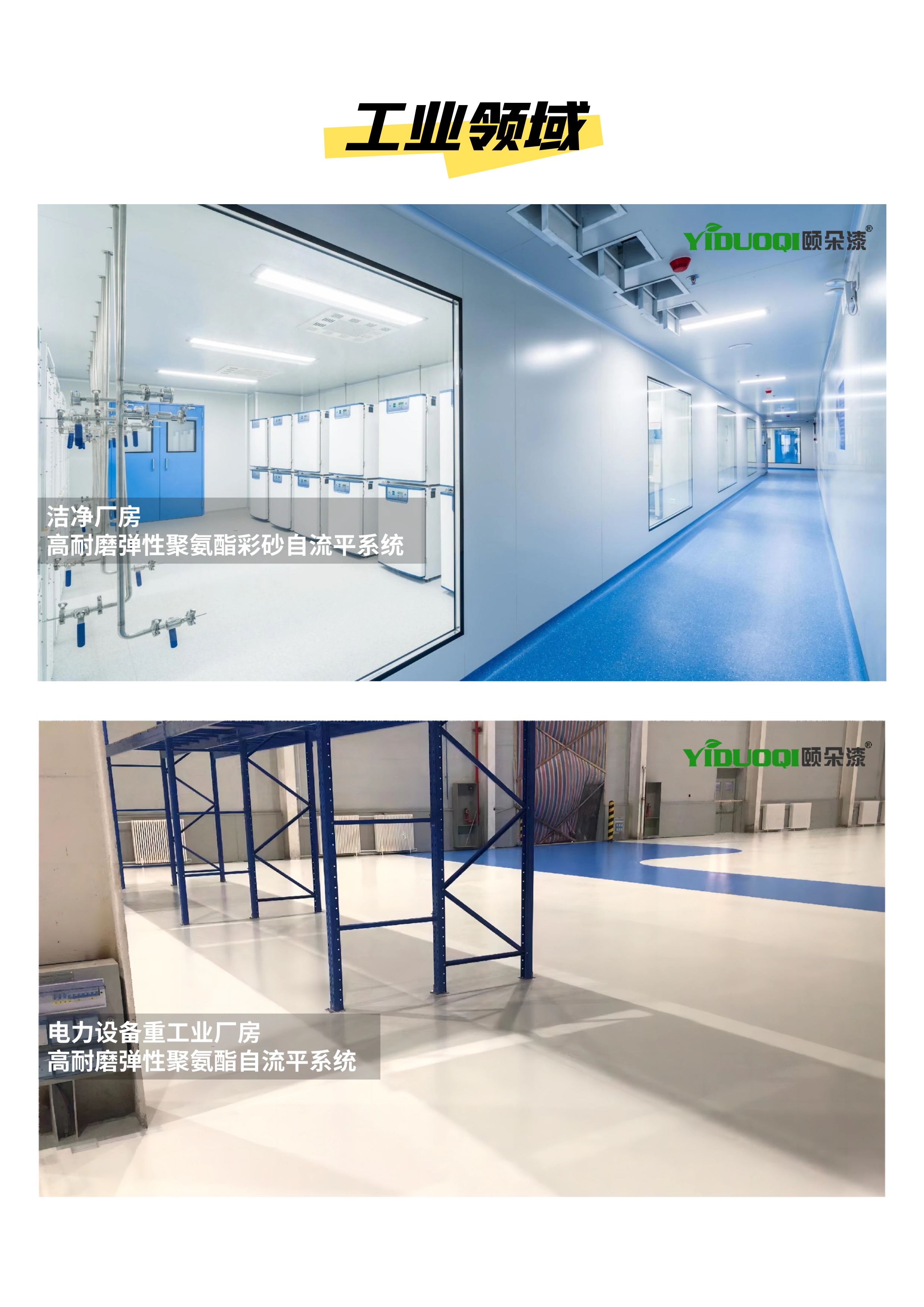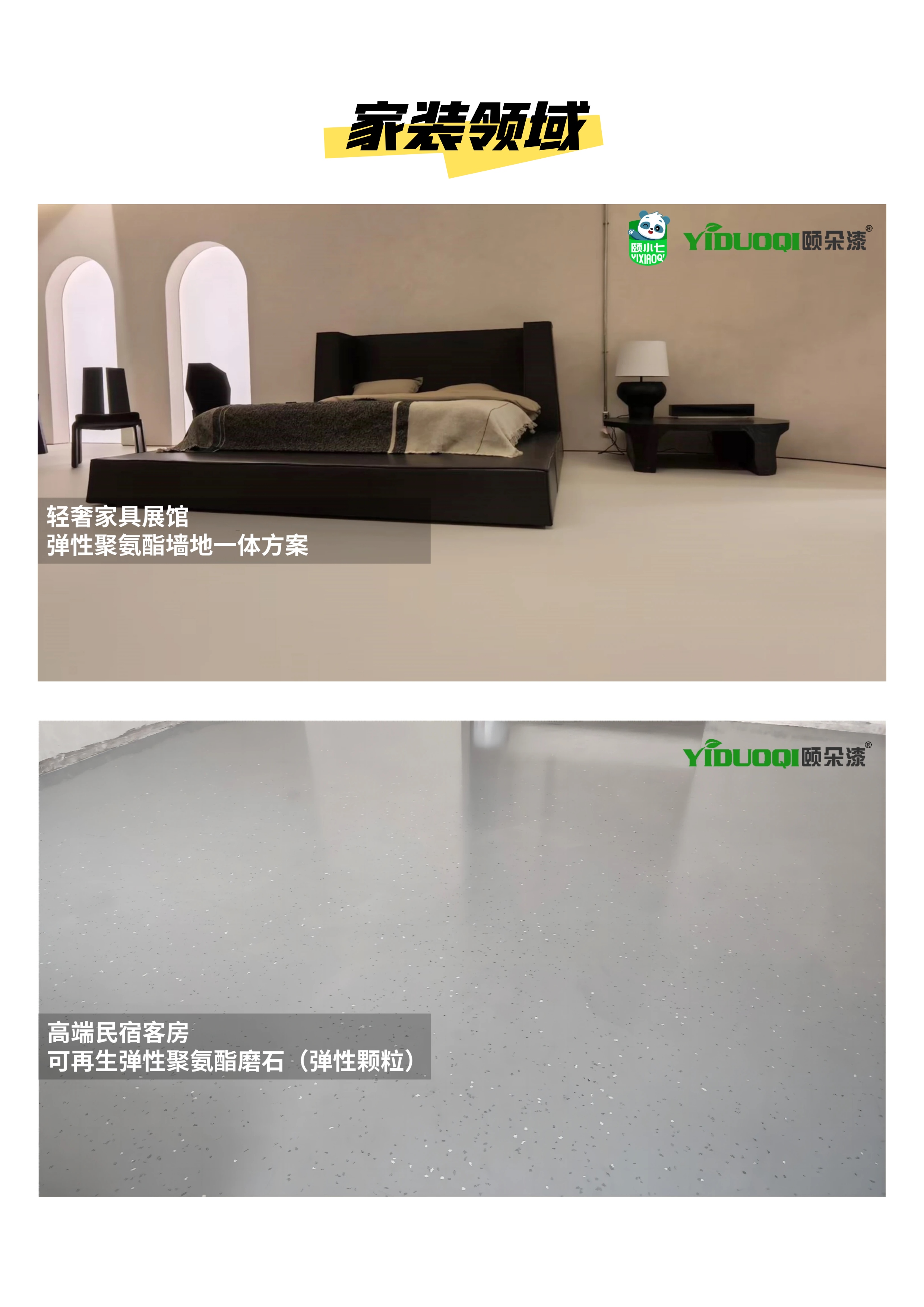 常规地坪材料一般均为刚性材料,硬,但易碎,稍有变形就开裂。如:常规环氧地坪的断裂伸长率通常为1-3%、水泥砂浆等无机类地坪因自身收缩而较易自身开裂,而弹性聚氨酯则更像橡胶——既有硬度又有弹性。YIDUOQI颐朵漆弹性聚氨酯体系,凭借对聚氨酯原材料的应用技术,实现按实际需要调整材料的弹性和强度范围,材料最软可达1500%以上断裂伸长率。当混凝土基层因温度或荷载开裂时,它像一张“高柔韧性膜”覆盖裂缝,抵御基层开裂,让地坪用得更久更省心。