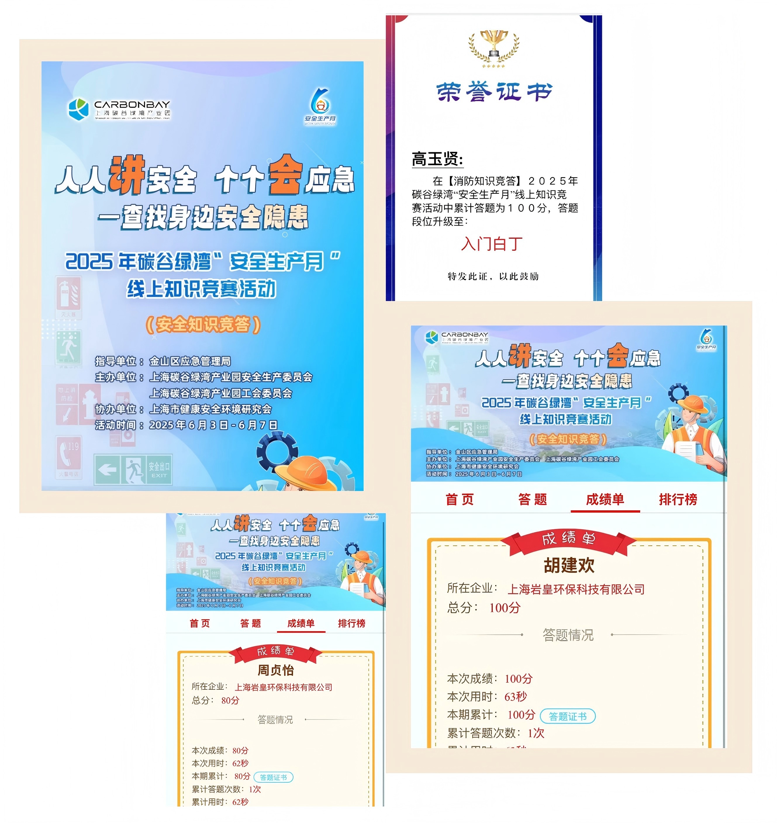 公司着力构建“全员参与、全程覆盖”的安全宣教网络。在厂区悬挂主题横幅、布置警示海报、张贴工作提示等,强化视觉引导;组织员工参与2025年碳谷绿湾“安全生产月”线上知识竞赛活动,组织员工参加观摩2025年碳谷绿湾危险化学品生产安全事故综合应急演练,一名员工荣获安全知识竞答“个人优胜奖”;同时开展线下安全知识答题活动,每期内容覆盖消防安全、职业健康、有限空间操作规范等领域,以考促学,巩固知识要点,激发员工自主学习的积极性。此外,紧密结合今年“查找身边安全隐患”的主题,鼓励引导员工主动排查身边的不安全行为及设备隐患,推动安全意识从“入眼入耳”走向“入脑入心”,转化为具体的防范行动。